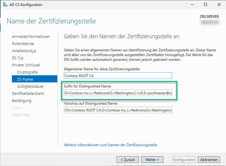 In Organisationen, die bereits seit längerem eine Zertifizierungsstelle betreiben, dürfte es nicht so einfach möglich sein, eine neue Zertifizierungsstelle aufzubauen. Es stellt sich dann auch die Frage nach dem echten Mehrwert der zusätzlichen Informationen. Schade ist, dass Microsoft keine Beispielwerte im Server-Manager bereitstellt. Zwar ist im Installationsassistenten ein entsprechendes Feld vorhanden, dieses ist jedoch leer.