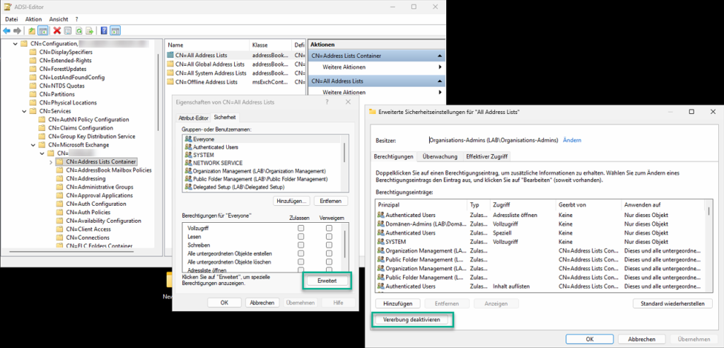 Zunächst muss jedoch der Zugriff auf die standardmäßig angelegten Adresslisten unterbunden werden. Die dafür erforderlichen Schritte müssen in der Active Directory Services Interfaces (ADSI)-Konsole durchgeführt werden: