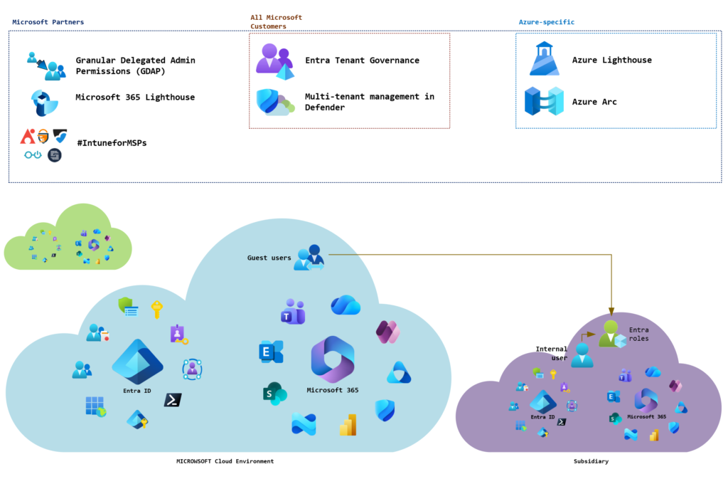 In addition to traditional user access, it is also possible, to a certain extent, to use central services for managing multiple tenants or environments. The following table lists all management solutions currently available natively in the Microsoft Cloud and their respective purposes: