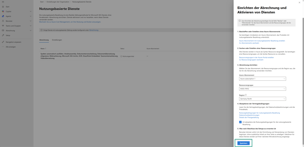 Finally, billing can be set up via the new Azure subscription. Important: This will not incur any costs initially! Costs will only arise when one of the services is activated and users begin using it, as outlined above.