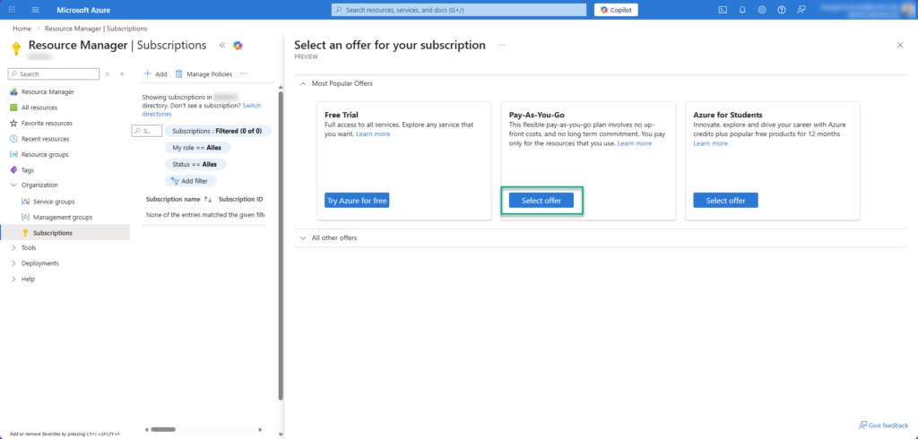 • Click on “Add” at the top and select the “Choose an offer” button from the menu in the “Pay-as-you-go” tile.