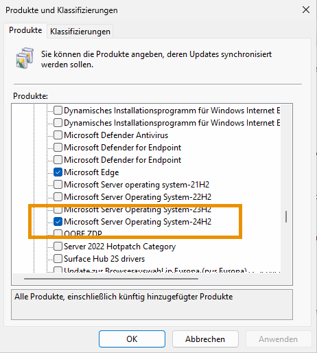 Interessanterweise ist Windows Server 2025 auch nicht (mehr) in der Liste der Betriebssysteme aufgeführt, auf die der Artikel zur Einrichtung der Gruppenrichtlinien angewendet werden kann. Das könnte zu der Annahme führen, dass Windows Server 2025 WSUS nicht länger unterstützt, zumal die Serverrolle von Microsoft abgekündigt wurde. Dies passt jedoch nicht damit zusammen, dass der WSUS weiterhin auch Aktualisierungen für Windows Server 2025 anbietet (im WSUS wird die Version als "Microsoft Server Operating System-24H2" angegeben).