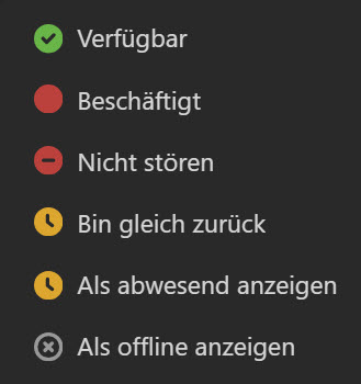 Der Verfügbarkeitsstatus ist eine Funktion, um anderen Personen anzuzeigen, ob man gerade erreichbar ist oder nicht. Zur besseren Unterscheidung sind hierfür unterschiedliche Optionen durch den Benutzer wählbar: